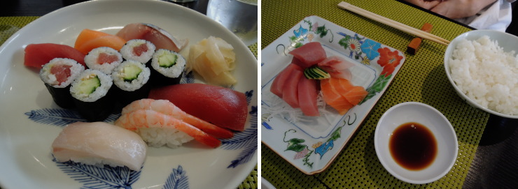 | フランソワーヌ(仮)は「刺身定食(€20)」、私達は「寿司定食(€25)」をオーダーしました。前菜は同じです。 |