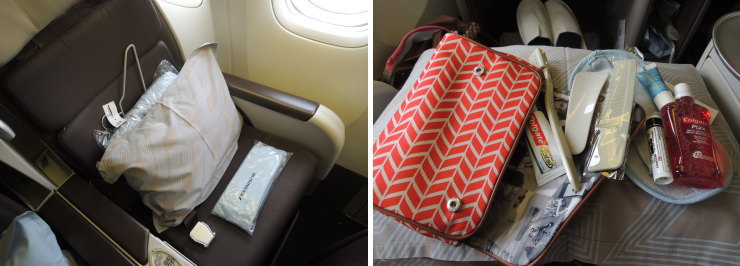 | 11時45分発エールフランス275便。初めてのビジネスクラスにワクワク♪豊富なアメニティキット、ふわふわの羽根枕にエコノミーとの差を実感。 |