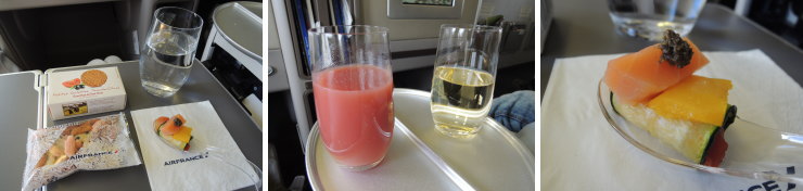 | 離陸前にウェルカムドリンク、離陸1時間後にはランチです。先ずはアペリティフ、スナックとおしゃれなアミューズが提供されました。 |