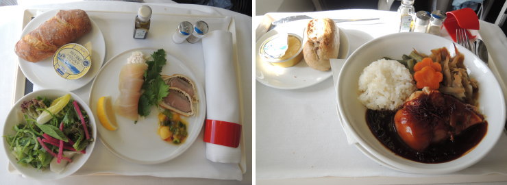 | テーブルクロスが敷かれ、お皿で提供。前菜ウマー!しかし、メインは「チョイスの牛肉とお魚は品切れです。日本食かベジタリアンのどちらにしますか?」って、なんでやねん。仕方なく日本食を選択。味が濃すぎてウエ〜。一口で箸を置く・・・ |