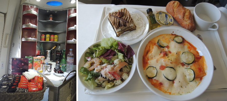 | 軽食コーナーにはドリンクも豊富。いつでも自由に飲めるのはありがたいですね。日本時間の21時過ぎに夕食(フランス時間では昼食になるのかな?)です。無事に選べたラヴィオリがウマー。 |
