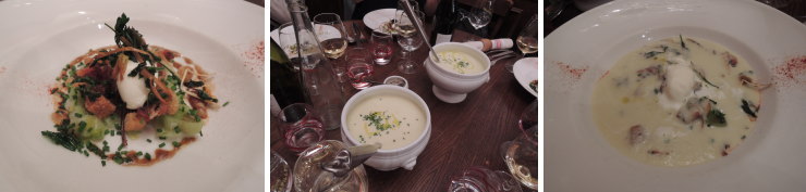 | メニューは日替わりの1種類(前菜、メイン、チーズ、デザートで1人35ユーロ)しかなく、その日の仕入れによって内容が変わるそうです。前菜はじゃがいものスープ。具材が入ったお皿に自分でスープを注ぎ入れます。何コレ、美味しいー! |