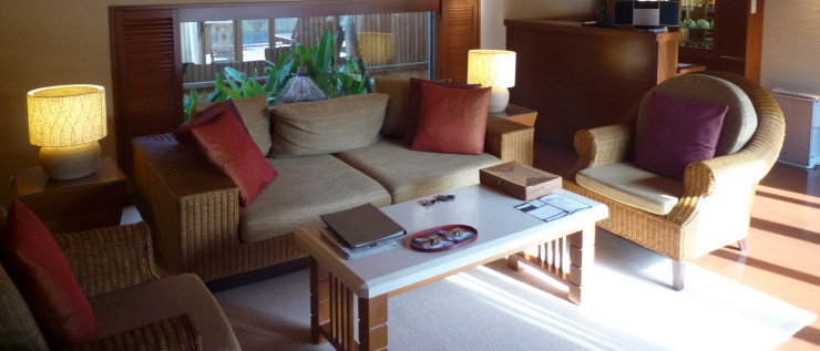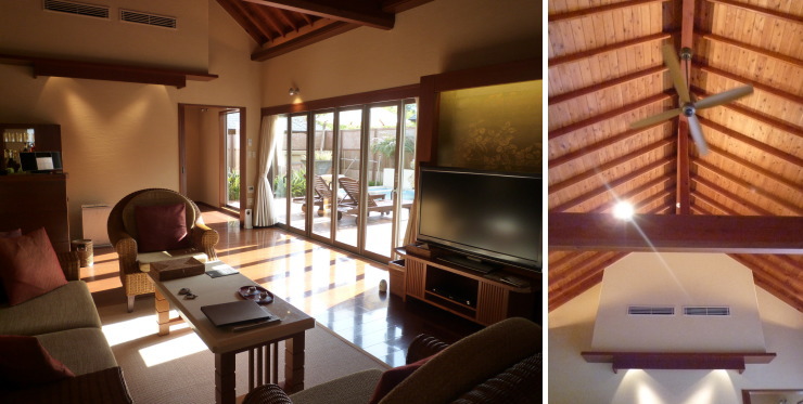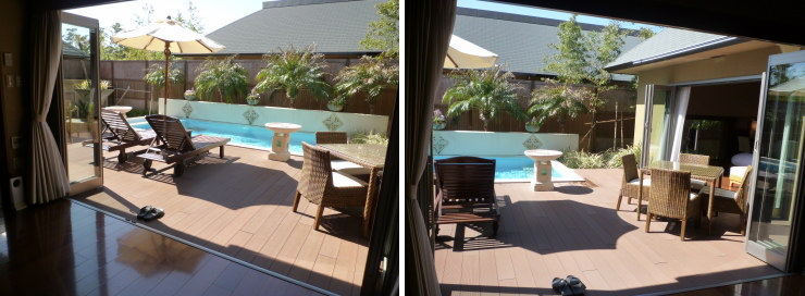 | 室内もですが、野外スペースも「毬」より狭く感じるんですよねぇ。どのヴィラも同じ400uってことなんですが。リビングの正面にお隣のヴィラの屋根がドーンと迫っているので圧迫感もありますし。 |