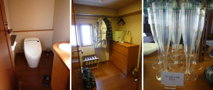 | トイレは2つ、クローゼットは余裕の広さで便利です。温泉用籠バッグもありました。ミニバーにはテラスで使用しても割れないようにプラスチック素材でできたプールデッキ用のグラス。 |