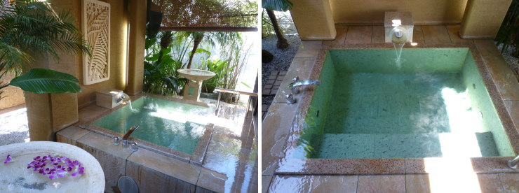 | 南国の雰囲気が漂う露天風呂。デザインはどのお部屋も同じようですが、「毬」よりお風呂の両サイドの植栽空間が少し広めでした。 |