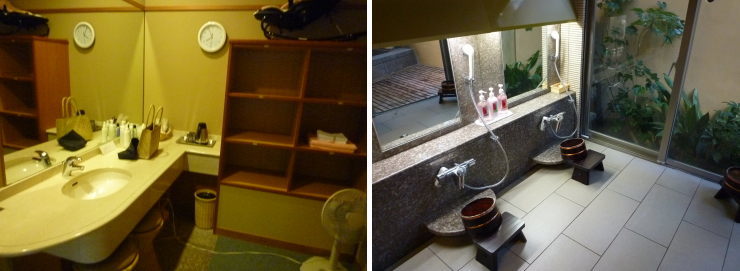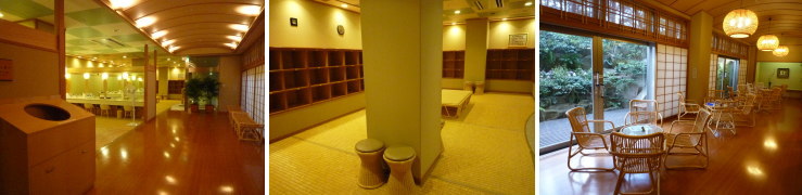 | ラ・松廬のゲストは本館・鴨川館の施設も利用することができます。せっかくなので、大浴場・貸切風呂・足湯に行ってみました。 女性用大浴場「白糸の美肌湯」の脱衣所です。広々〜。 |