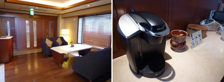 | こちらは「別館ラ・松廬」のサロンです。コーヒーメーカーや冷水、ちょっとしたおやつが用意されています。前回泊まった時に一目惚れしたキューリグコーヒーメーカー。即効自宅用に買ってしまった(笑)。ホント、コレ美味しいです! |
