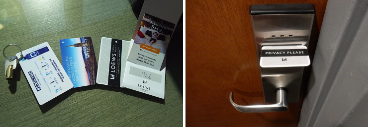 | 私たちの客室は11階。カードキー2枚に冷蔵庫の鍵も。プライバシーサインはめずらしいドアに差すタイプ。 |