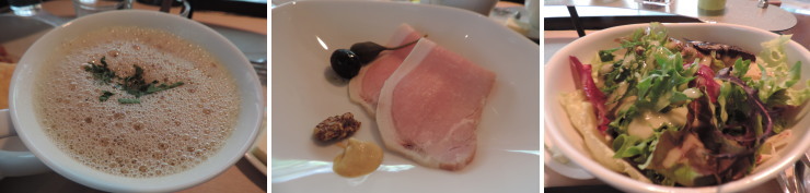 | キノコたっぷり野菜スープ、自家製ロースハム、グリーンサラダ。どれも美味しー! |