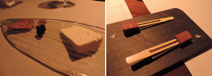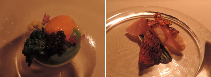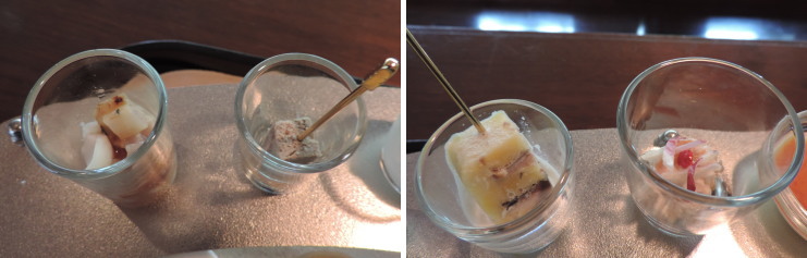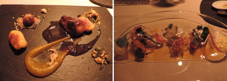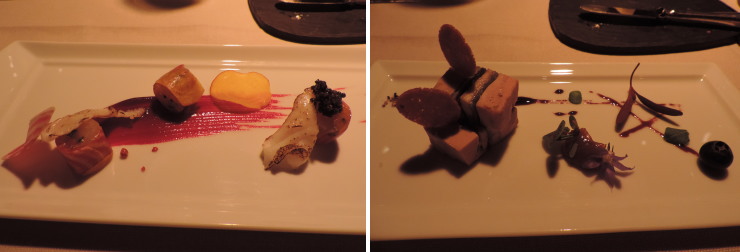 | アレンジ2皿目の「鯛のビーツソース」とアレンジ3皿目の「フォアグラと鰻のテリーヌ」。どんなメニューに代わるのかは知らなかったのですが、何と3皿も!。チェックインしてからのメニュー変更でしたが、その対応力はさすが! |