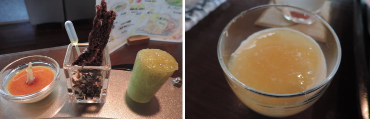 | 根セルフィーユのプリン、黒米のおこげ、根セロリとキウイフルーツのエスプーマ。後からハチミツをトッピングしたフロマージュもサーブされます。朝からこんなに充実したメニューを食べられる宿ってなかなかないですよねー(*゚Д゚*) |