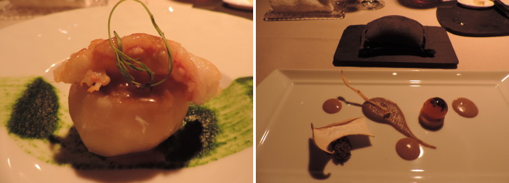 | 通常のコースメニューに戻って「蕪の器に入った赤座海老と毛蟹」、「駿河湾の極上鮮魚」。 |