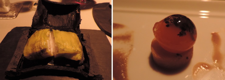 | 極上鮮魚は黒土の中から現れます。手前のお皿には黒トリュフが入った卵黄をキノコと牛蒡のソースで頂きます。 |