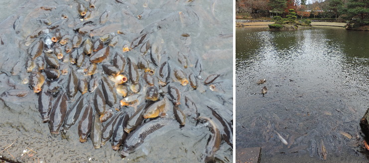 | 鯉のエサは自販機で購入できます。早速あげてみると・・・凄いです!必死です!(笑) |