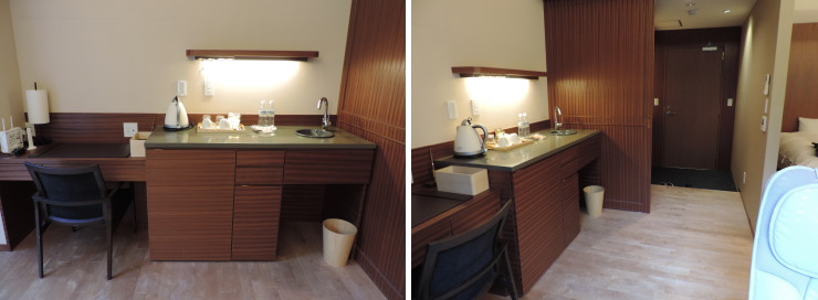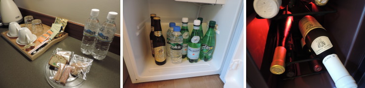 | コーヒー、紅茶、緑茶、お菓子と無料のミネラルウォーターが2本。冷蔵庫の中のものは有料です。ワインセラーもありました。 |