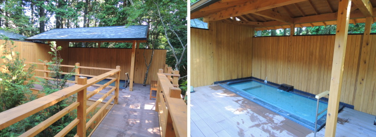 | 今年の7月に完成したばかりの露天風呂。森の中に架かる橋を渡って行きます。 |