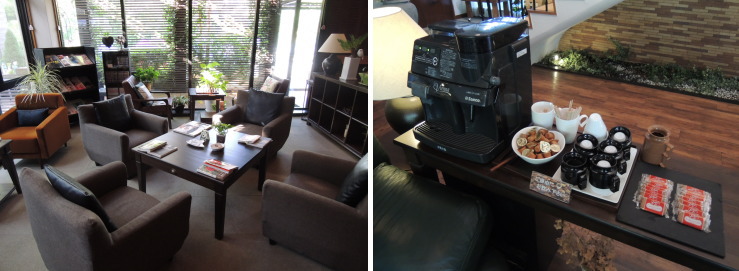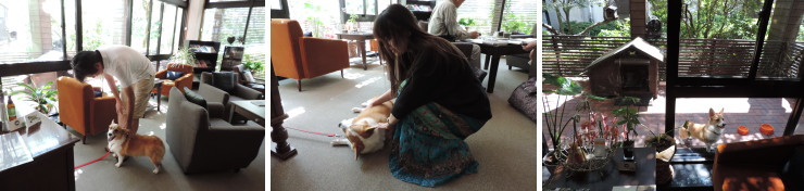 | ラウンジにはセルフのコーヒーや雑誌、大人しいワンコ(Renくん)もいます!先ほどの愛想が良すぎるワンコはお外からジロジロ(笑) |