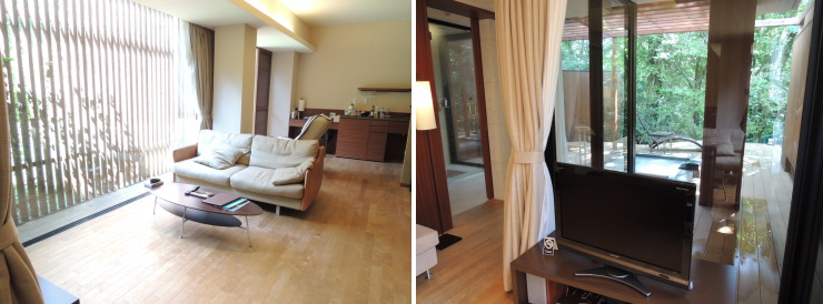| テレビ後方には客室露天風呂が見えます。左手には洗面脱衣所。カーテンがありますので、リビングからの視線は完全に遮断することができます。カーテン閉めても部屋が暗くならないのがいいですね〜 |