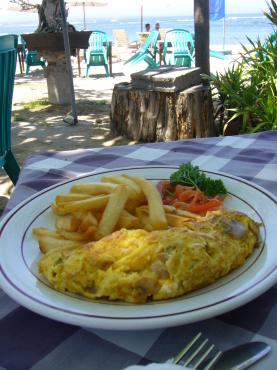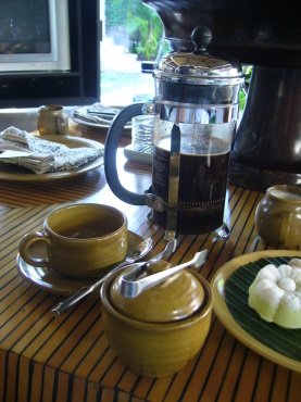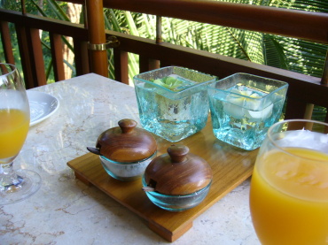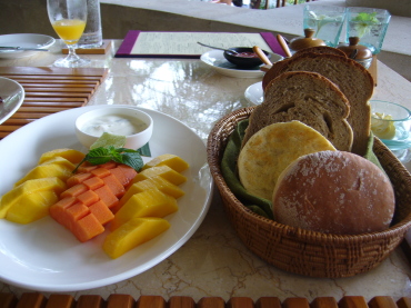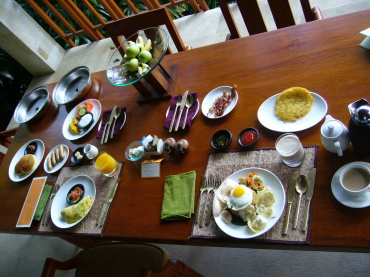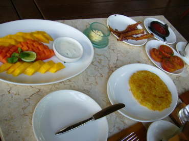 | 5日目の朝食 ガンサも朝食付きです。 サヤンと同じく好きなものを好きなだけ。 ヴィラ内のアウトドアリビングで頂きました。 |