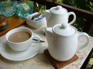 | 3日目のランチ あまりお腹が空かないので、この日のランチはウブドの街の カフェでカフェ・オレとピサンゴレンのみ。 ピサンゴレン(揚げバナナ)はなかなか美味しかった! |