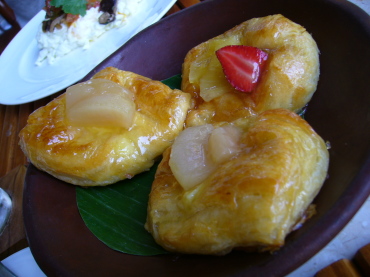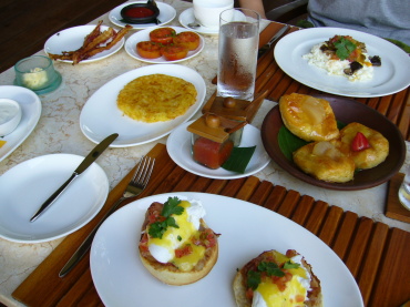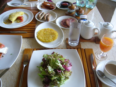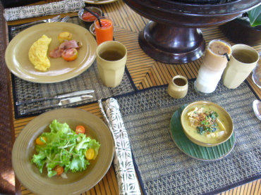 | 2日目の朝食。 ホテルのメインレストラン「アユンテラス」にて。 朝食付きのプランにしたので、好きなものを好きなだけ オーダーできます。 |