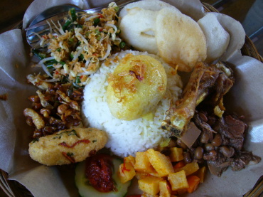 | 2日目のランチ バリごはんといったらやっぱり地元の人達が集う 安くてうまい食堂でしょっ! ってことで、ガイドブックでナシ・チャンプルが 美味しいと評判の「マンガ・マドゥ」というお店へ。 |