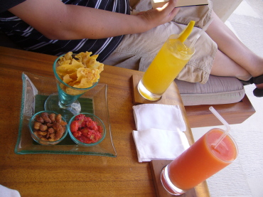 | 夕方にホテルのバーでサヤン・フィズとパパイヤジュースを。 サービスのおつまみも洒落てます。 読書しながらのんびりタイム・・・・ |
