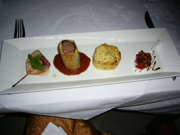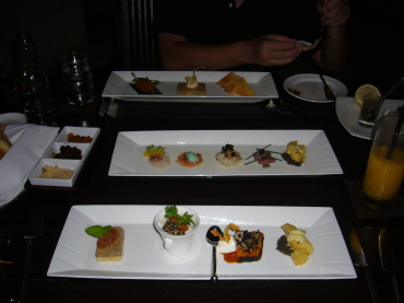 | フォアグラのオードブル | いろんな味を少しづつ。こういうの大好きです! しかーし、味は期待外れ・・・ 凝りすぎてどれも変な味になっちゃった、って感じでしょうか^^; |