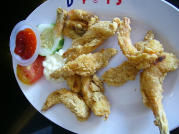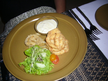 | フライドカラマリです(80000ルピア)。美味しい〜 | ロブスターとホタテのホットサラダ(69000ルピア)。 これも美味しい〜 |
