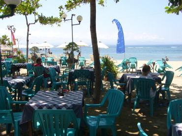 | 5日目のランチ サヌールビーチにあるボンサイ・カフェへ。 目印はこのゲート(右写真)。 ずらっと並んだ盆栽たちの横を通り抜けると、 サヌールビーチにオープンカフェが広がります。 |