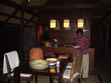 | ウブドに到着したのは夜遅くだったので、初日のディナーはルームサービスにしました。ここぞとばかりに"バリごはん"をオーダー(笑) ヴィラの大きなダイニングテーブルでいただくことに。素晴らしい雰囲気です♪ |