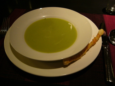 | ゲストの目の前で最後の仕上げを。 | 注がれたのは、グリンピースのスープ。 |