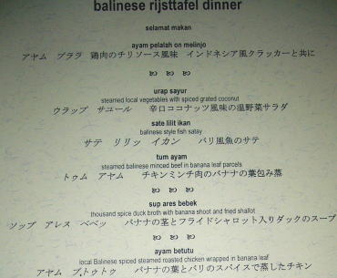 | 2日目のディナー ホテルのアユンテラスにて「バリニーズ・リスタフェル」 ディナー。 バリごはんで有名なバビグリン(仔豚の丸焼き)や イカンバカール(焼き魚)もコースに入っている ホテルのスペシャルディナーです。 ワインとアップルジュースを頼んで、 2人でトータル約20,000円。 |