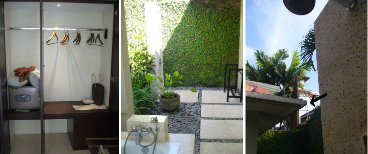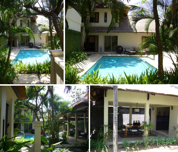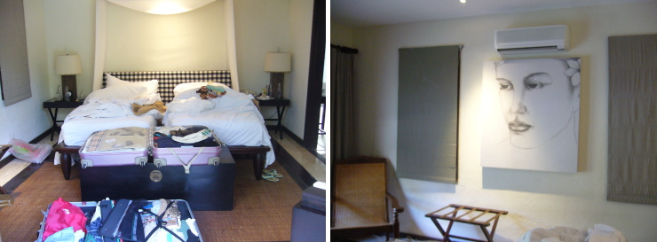 | なんかですね、とっても居心地が悪かったんです。どこにいても何かが足りなくて落ち着かないというか・・・。 敷地は広いんですけど、それぞれのスペースが小さく区切られていて、せっかくの広さを実感できない感じ。 また、2階建てのヴィラのせいか、お隣との仕切りの塀が高く、閉じ込められているような圧迫感がありました。 この後に泊まったカユマニス・ジンバランも同じように塀に囲まれたヴィラなのに全く圧迫感がなかったので、塀の高さ、住宅地という立地やレイアウトに原因があるのかも。 「壁1枚挟んですぐ民家」な感じ(テレビや話し声がすぐ隣で聞こえた)も気になりました。 これはヴィラの位置でずいぶん印象が違うかもしれません。 あと、なぜだか分からないんですが、南国のヴィラでは感じたことのない寂しさや怖さも感じたんですよね。1人でいられないというか。特にサブベッドルームや2階が怖くて・・・。顔の絵のせいかしらん?? フォーシーズンズ・サヤンの上質な家具に目や身体が慣れてしまった後だけに、全体的に安っぽくも感じてしまいました・・・(泊まる順番を間違えましたね)。 でも、スタッフは皆フレンドリーで親切。小さなホテルだけにアットホームな気軽さが良かったです。 辛口になってしまいましたが、きっと私たちがこの手のリゾートホテルに贅沢になってしまっているだけで、決して悪いホテルではないとは思います。 |