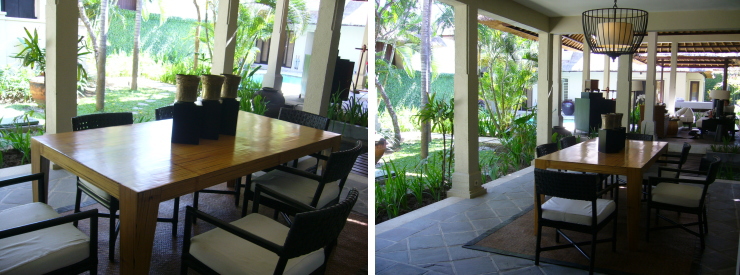 | ヴィラに入ると左側にプールと2階建てのヴィラが広がり、正面には半屋外のダイニングとリビングがあります。 | |