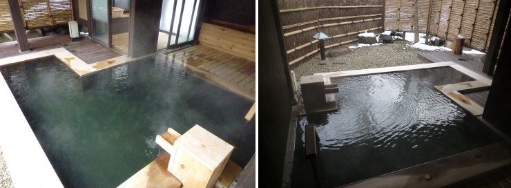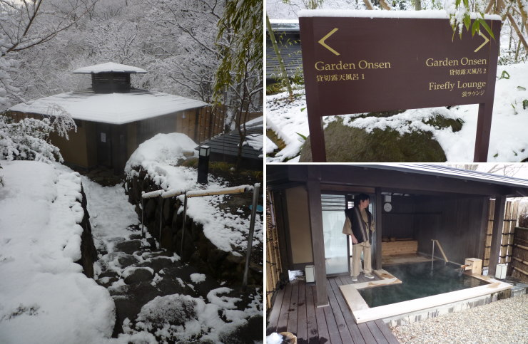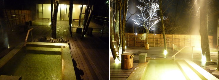 | 一番混みそうな夕食後に行ってみたんですが、やっぱり誰もいない(笑)。ライトアップされた夜の露天風呂も素敵な雰囲気です。入浴中に雪がドーっと降り出したんですが、ライトに照らされて浮かび上がった舞い散る雪が感動的な美しさでした。 |