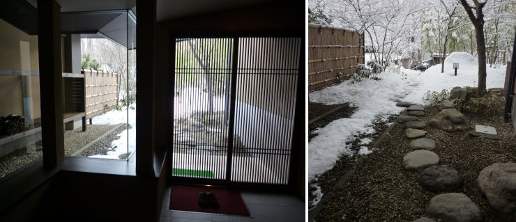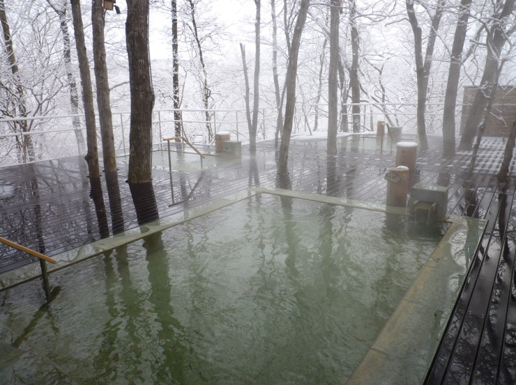 | 何度も入ったお気に入りの「ぬるゆ」からの入浴目線。美しい雪景色に囲まれて本当に気持ち良かったです。この「ぬるゆ」と「あつゆ」は先客がいたら入りにくい大きさではありますが、なぜかいつ行っても誰もいなかったので、この広い空間を何度も独占することができました。 |