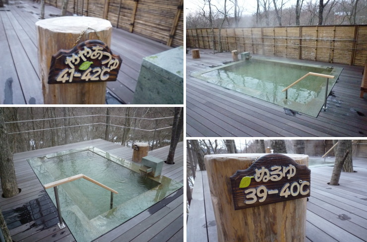 | 露天風呂は開放的で広々としたデッキに3つあり、一番手前が10人ほど入れそうな大きな浴槽、中央と先端の浴槽は3〜4人用の小さめな浴槽です。デッキの下は崖になっていて、川が流れているのが見えました。 |