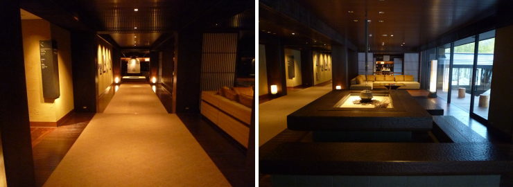 | エントランスを入ると釣鐘へと一直線に続く廊下。上質な滞在を予感させます。右側には囲炉裏のあるロビー。 |