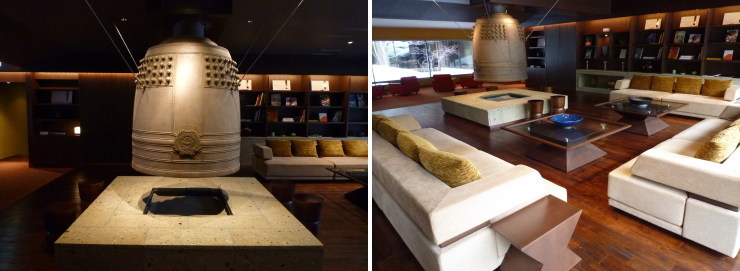 | さらにその先にはライブラリーを兼ねたラウンジがあります。このロビーからラウンジにかけての空間はとても素敵なんですが、何か飲めるわけでもなく、ライブラリーの本も読むというより絵のように飾ってある感じなので、結局ここに座ったのはチェックインのときだけでした。これほどの宿だったら、ドリンクサービスなどがあってもいいように感じました。 |