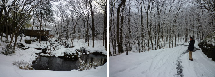 | 翌朝の雪景色の中の露天風呂です。湯気と木々に降り積もった雪で美しく幻想的な景色になっていました! |