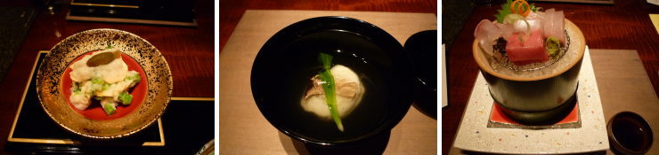 | 左から小鉢「菜の花と土筆」。これも美味しくもなく不味くもなく・・・。「蟹のお吸い物」は何故か化学調味料の味・・・。この辺からアレ、なんか変だなと思い始めて・・・。向附の「近海鮮魚の盛り合わせ」は素材が良いので美味しかったです。 |