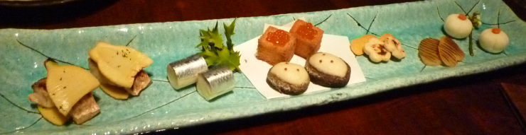 | 焼物八寸。下記の写真は2人分です。テーブルでそれぞれのお皿に取り分けてくれますが、担当が新人さんのようで、緊張して1品をコロコロ〜とテーブルに落としていました。まぁ、そこはノ〜プロブレムってことで(笑)。 |