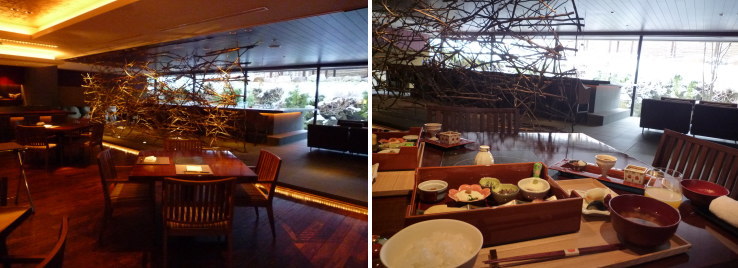 | 食事は和食レストラン「竈神(かまじん)」でいただきます。3フロアに区切られて、中庭に面した半個室が数席、テーブル席のフロアが2つ(1つは鉄板焼きコーナーがあるフロア)ありました。 |