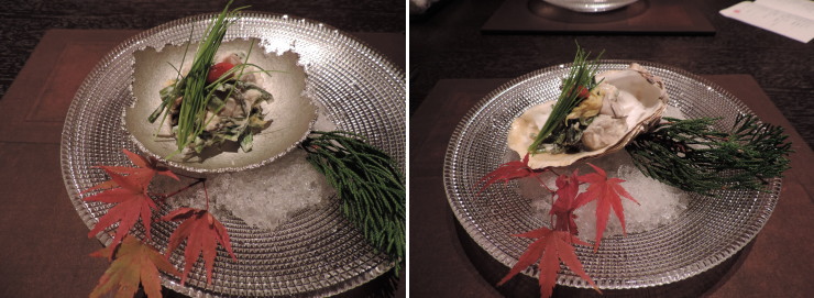 | 先付の「蛤クリーム白和え」。本来は牡蠣なんですが(写真右)、私が牡蠣アレルギーなので蛤に替えてくれていました。とっても美味しい! |