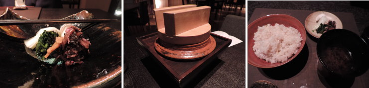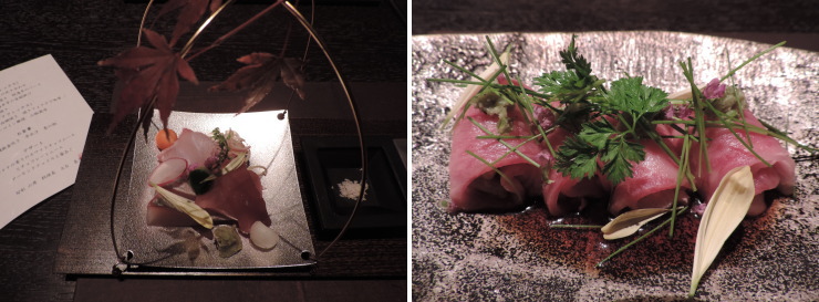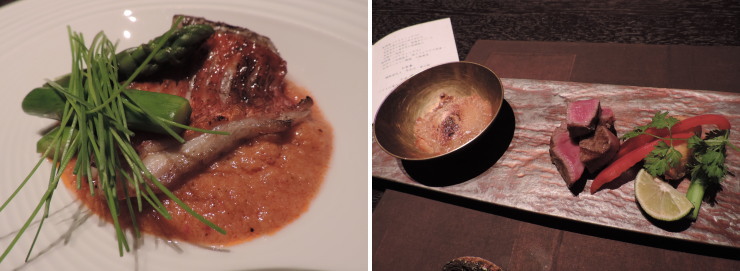 | チョイスは2人とも「稲取金目の炭焼き・桜海老のソース」と「和牛ヒレ肉網焼き・焼きフォアグラ味噌」。金目の方は、ソースの味が強すぎて金目の味が消え、和牛の方も味噌が強すぎてお肉の味が消えてしまう。それぞれバラで食べると美味しいんですけど、創作しすぎて失敗しちゃった感じ。 |
