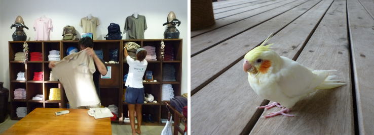 | 中にはショップもあります。そしてそして、ダイビングセンターのアイドル、インコちゃんです〜♪♪ |