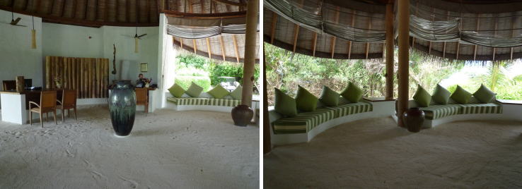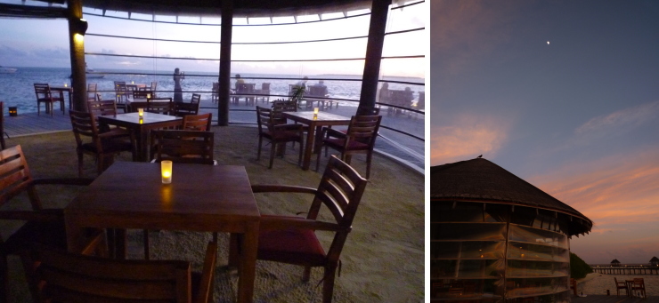 | 絶景のメインレストラン、"マティファルレストラン"。雨期であるこの時期は風が強い日が多く、残念ながらビニールシートが下りている日が多かったです。 |