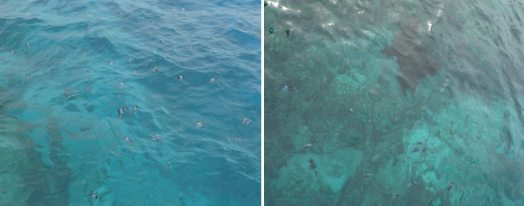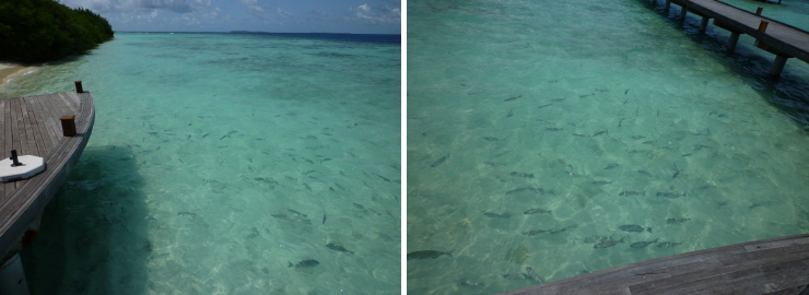 | マリーナの下にはいつも黒白のお魚さんが群れていました。エイも悠々と通過中〜♪ |