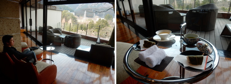 | 先にチェックインの手続きを。ウェルカムドリンクは桜茶または緑茶、スイーツは桜餅。桜(食用)が大の苦手な私は・・・(´・ω・|||)。緑茶があって良かった^^; |